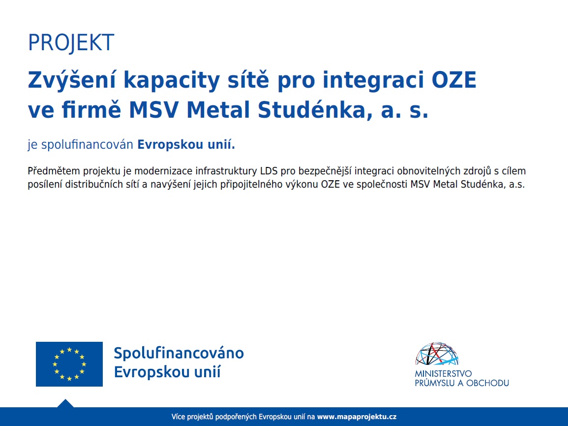 Gegenstand des Projekts ist die Modernisierung der LDS-Infrastruktur für eine sicherere Integration erneuerbarer Energiequellen mit dem Ziel, die Verteilungsnetze zu stärken und ihre Anschlussleistung für erneuerbare Energiequellen bei der Firma MSV Metal Studénka, a.s. zu erhöhen.